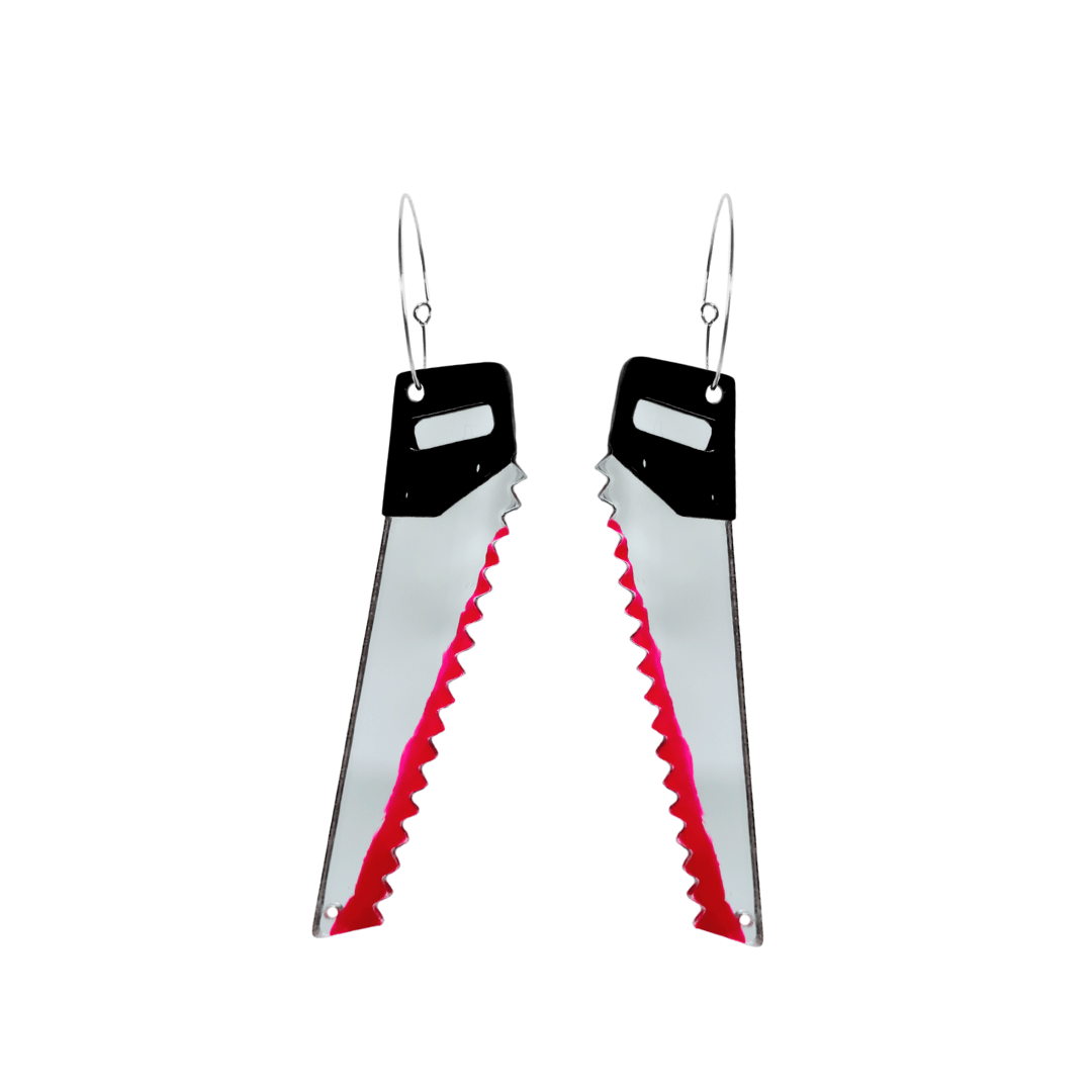 Haus of dizzy saw shaped earrings with black handles and silver blades with red blood detail on a white background