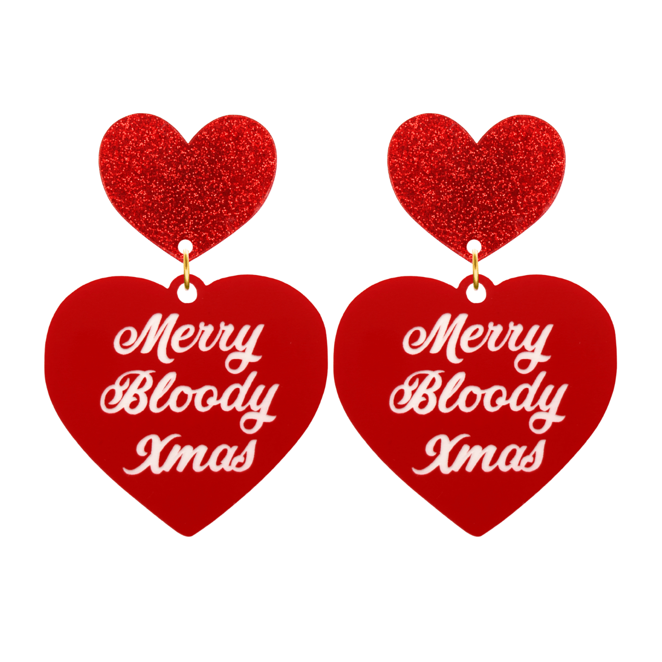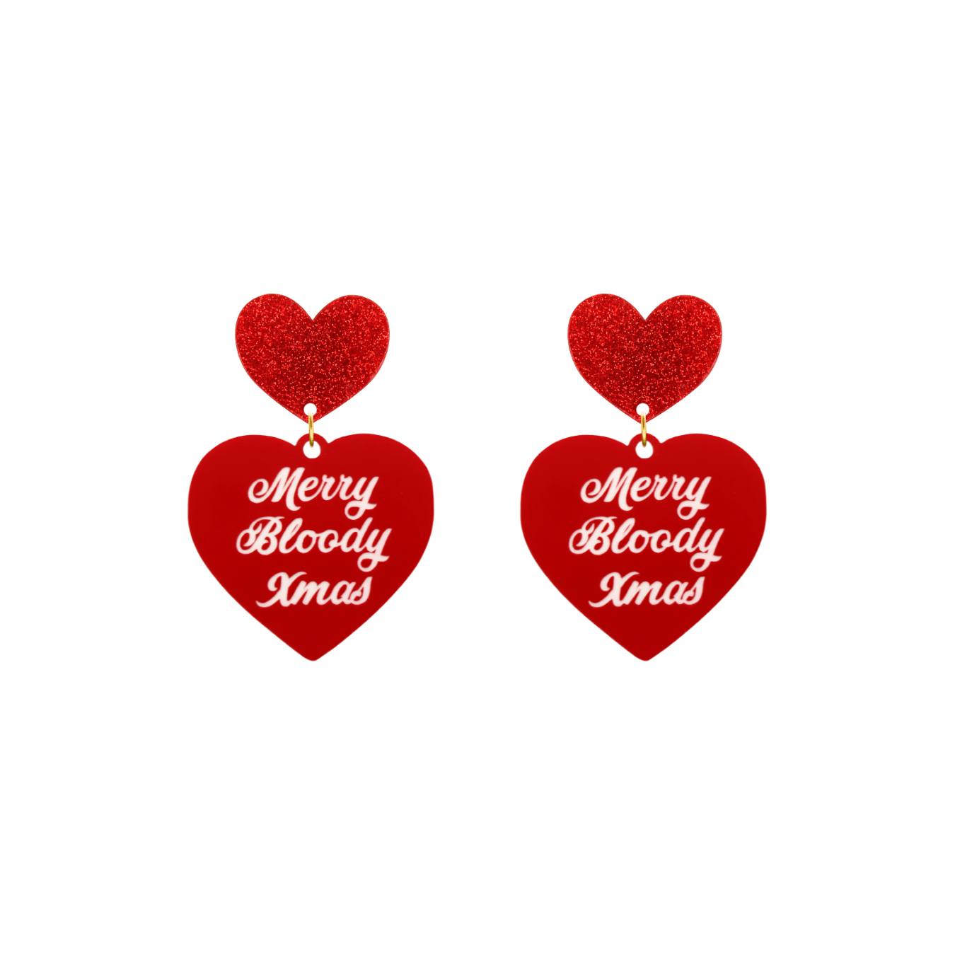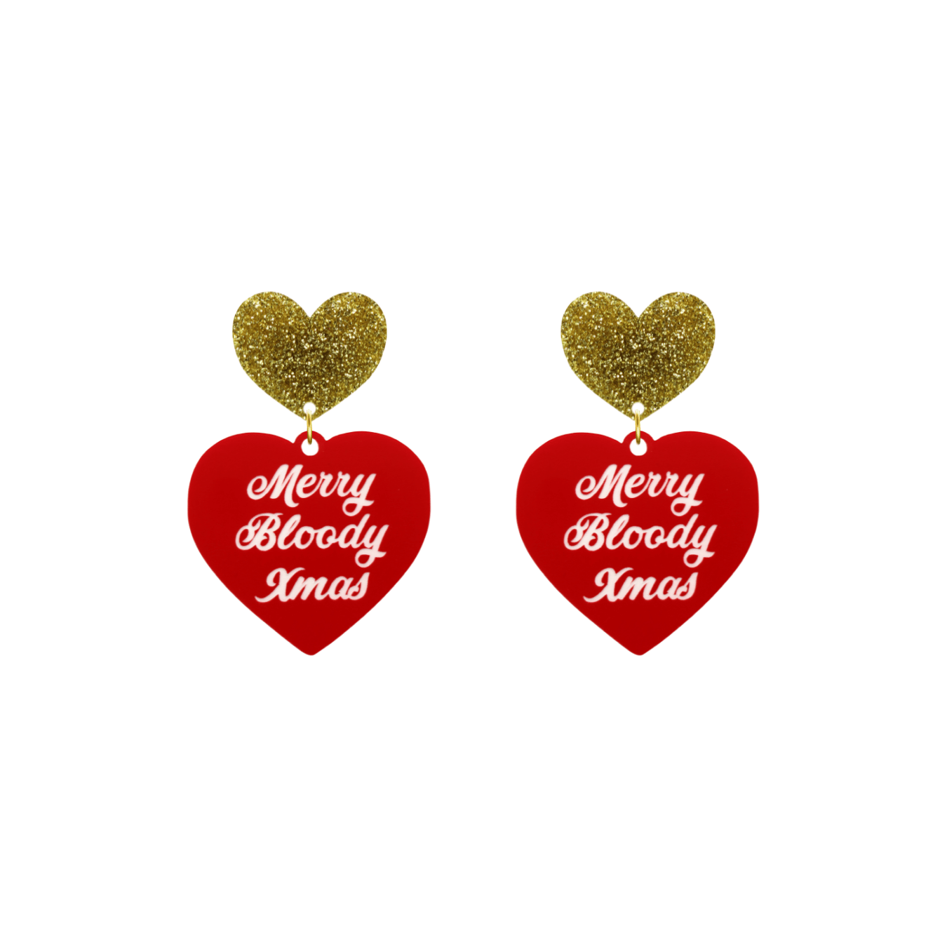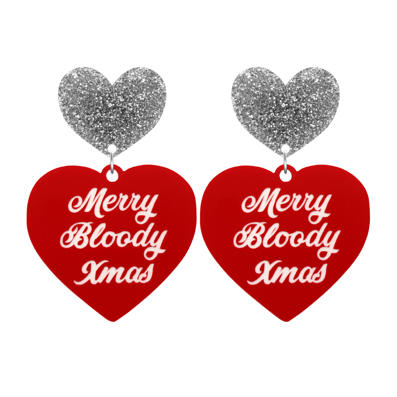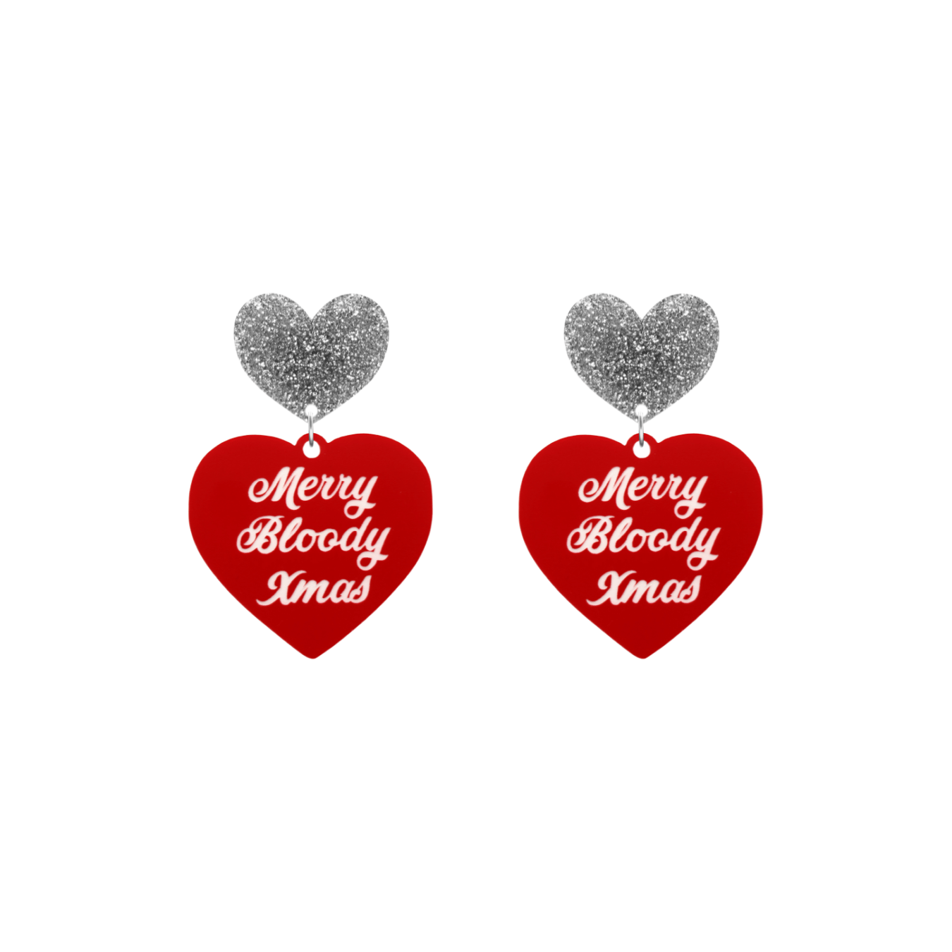 Red heart with white "Merry Bloody Xmas" text and your choice of coloured heart with stud, heart with clip-ons or hooks (heart tops N/A).