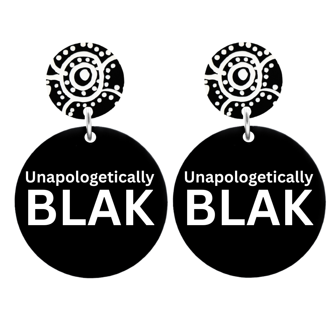 Black hand painted acrylic circle with ‘Wiradjuri Yinaa’ pattern circle top and your choice of studs or clip ons.