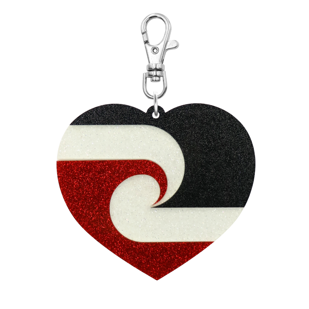 An image of Haus of Dizzy 'First Nations Pride' Glitter Maori flag, heart shaped keychain, with red, white and black glitter acrylic
