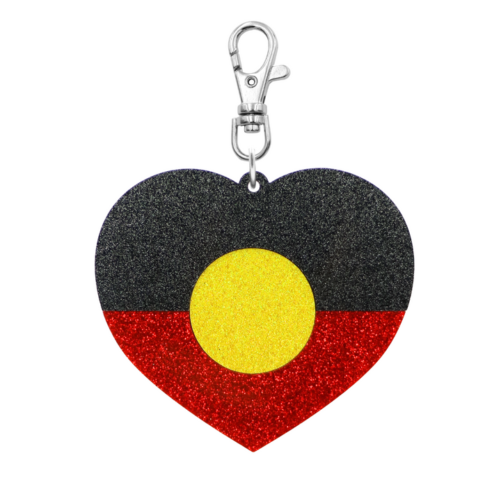 An image of Haus of Dizzy 'First Nations Pride' Glitter Aboriginal flag, heart shaped keychain, with black, yellow and red glitter acrylic