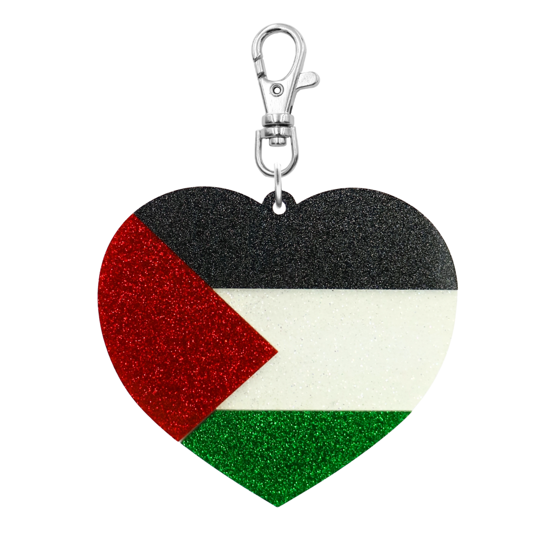 An image of Haus of Dizzy 'First Nations Pride' Glitter Palestine flag, heart shaped keychain, with black, red, white and green glitter acrylic