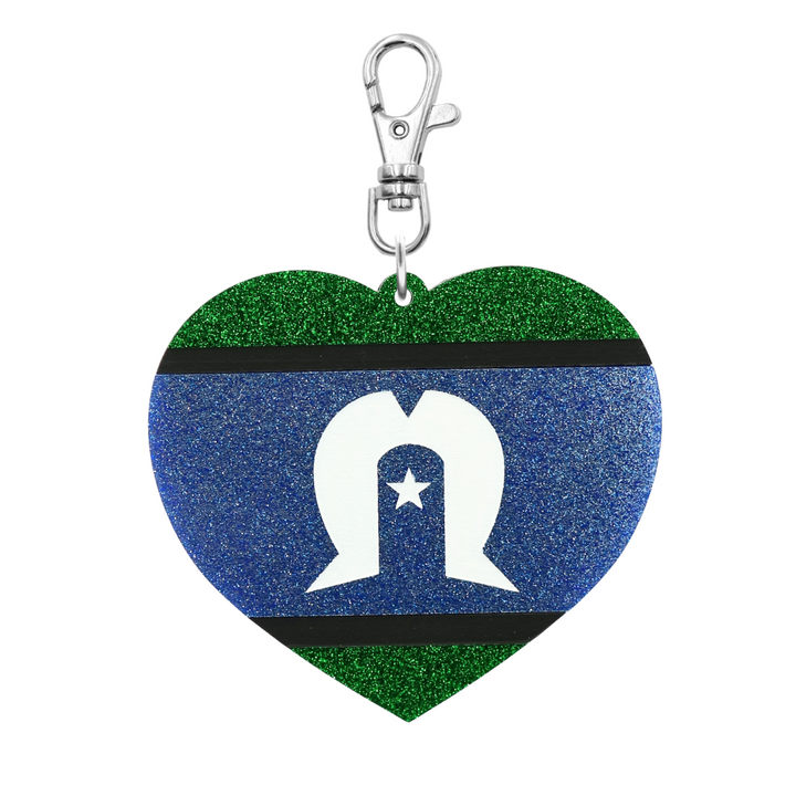 An image of Haus of Dizzy 'First Nations Pride' Glitter Torres Strait Islander flag, heart shaped keychain, with green and blue glitter acrylic with red and white paint fill
