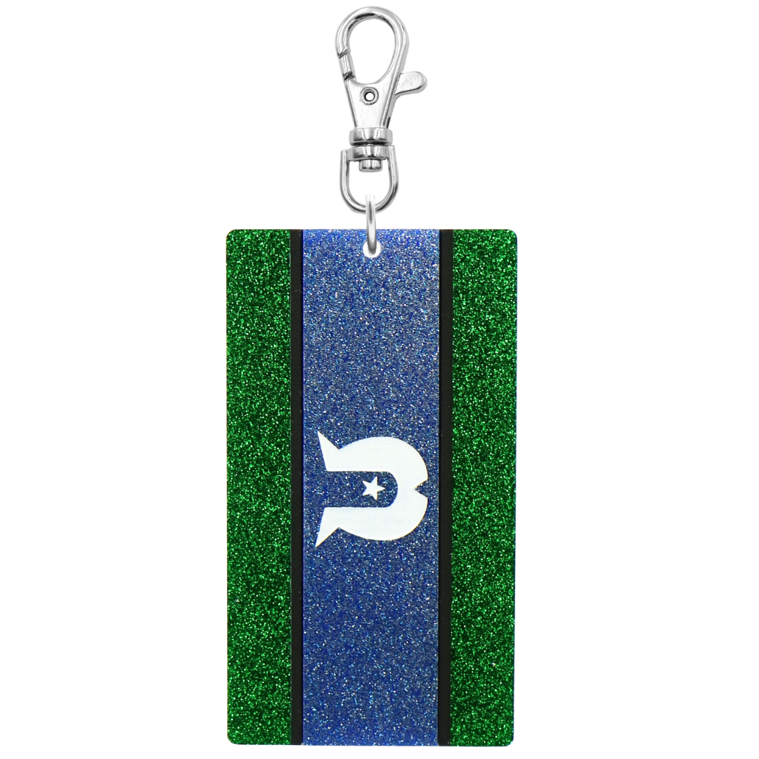 An image of Haus of Dizzy 'First Nations Pride' glitter Torres Strait Islander flag, rectangle shaped keychain, with green and blue glitter acrylic with red and white paint fill.
