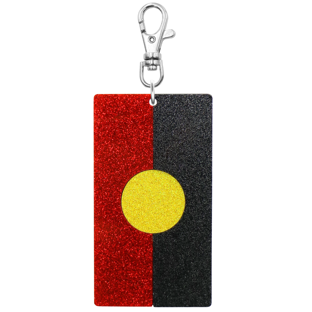 An image of Haus of Dizzy 'First Nations Pride' glitter Aboriginal flag, rectangle shaped keychain, with black, yellow and red glitter acrylic.