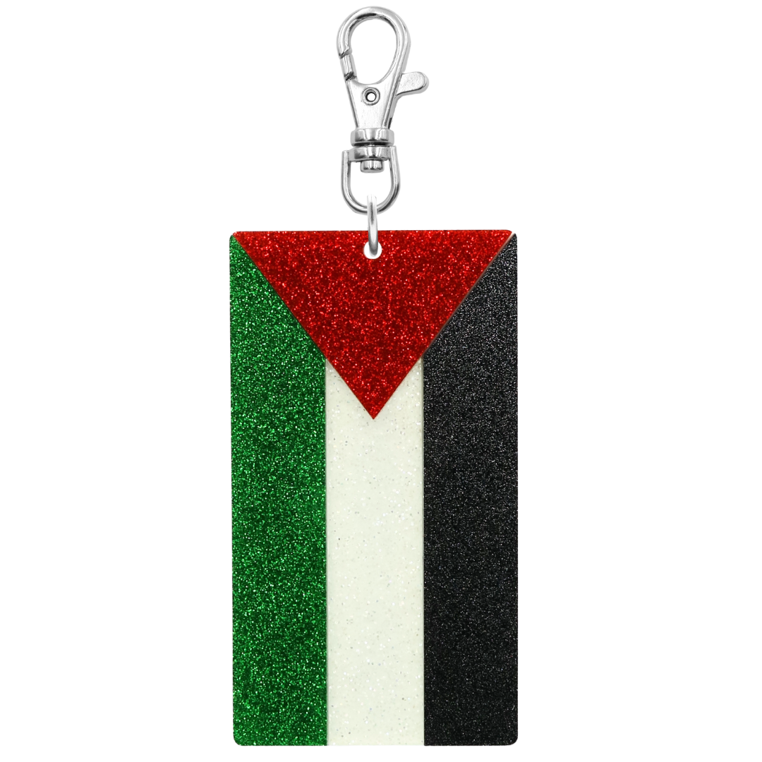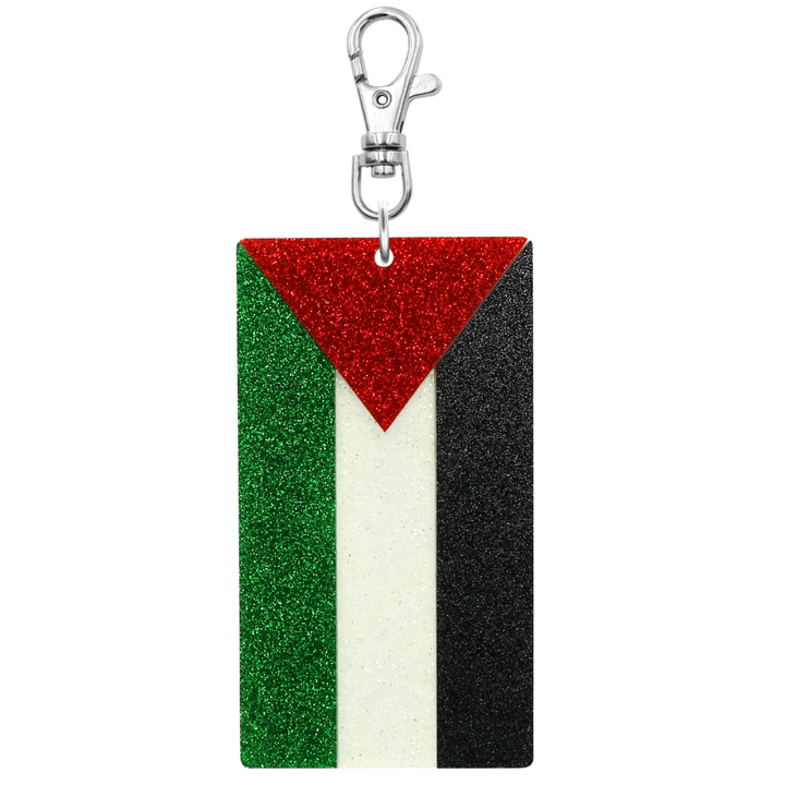 An image of Haus of Dizzy 'First Nations Pride' glitter Palestine flag, rectangle shaped keychain, with black, red, white and green glitter acrylic.
