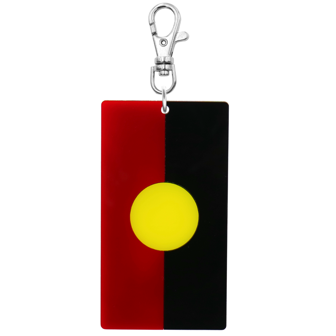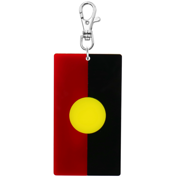 An image of Haus of Dizzy 'First Nations Pride' Gloss Aboriginal flag, rectangle shaped keychain, with black, yellow and red gloss acrylic.