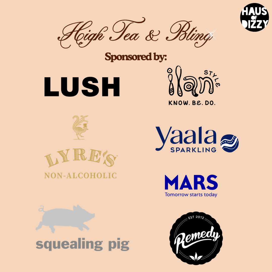 We have several incredible sponsors ready to make your High Tea experience sparkle! ✨ All guests will create a Haus of Dizzy charm necklace, take home a lush goodie bag, enjoy a beautiful high tea spread with sweet and savoury nibbles like M&Ms, and sip on drinks from our amazing partners: Remedy, Lyre’s Non-Alcoholic, Squealing Pig, Yaala Sparkling, and Ilan Style🥰